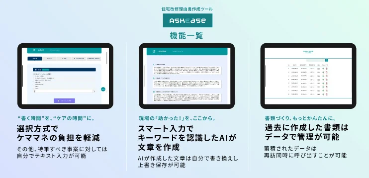 プレスリリースタイトル:ケアマネジャーの「書く時間」をゼロに近づける!住宅改修理由書作成ツール ASKEASE(アスキー)を提供開始